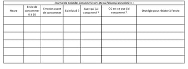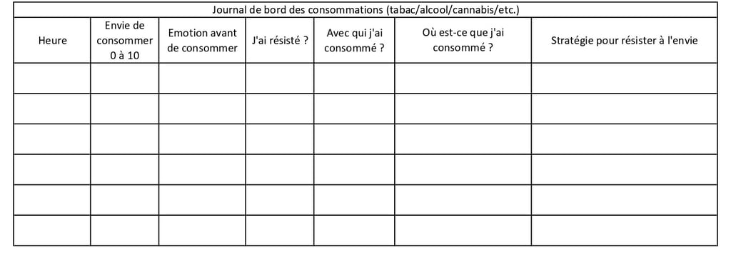 .Ce tableau permet de savoir ce qui déclenche l’envie : un contexte particulier, une émotion. L’idée est de le remplir au maximum et à chaque fois que vous consommez pour observer l’évolution de votre consommation. Ajoutez autant de colonnes qu’il y a de consommation dans la journée. Puis, vous pouvez ajouter une colonne pour observer le nombre de fois où vous résistez aux envies de consommer et quelles stratégies vous avez mis en place.